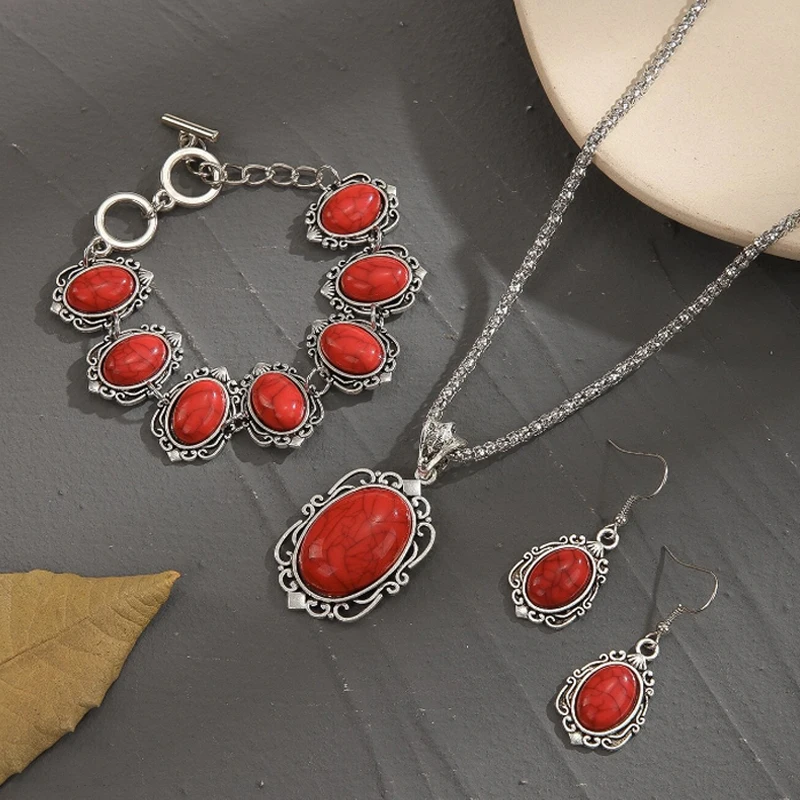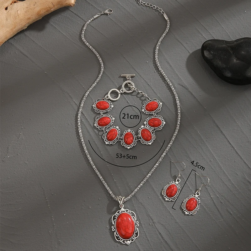 Name:3PCS Vintage Antique Silver Natural Red Stone Jewelry Set